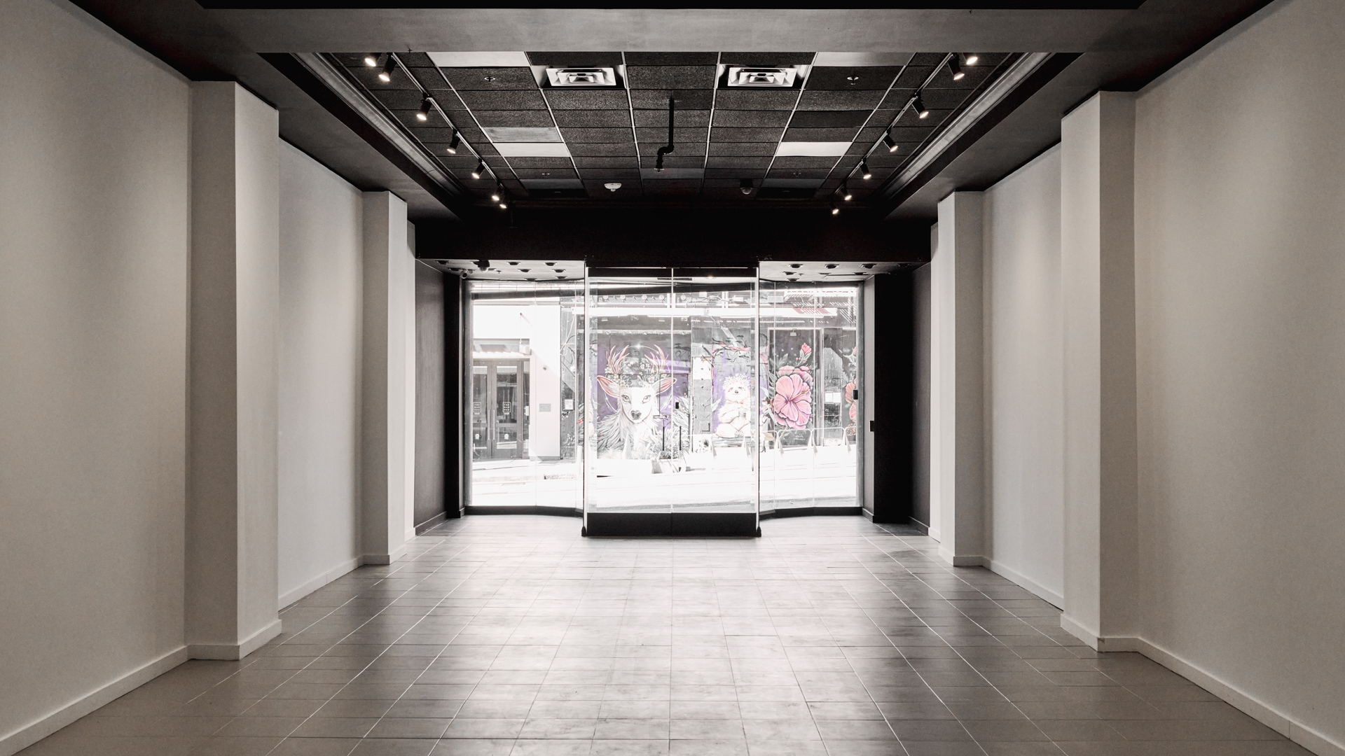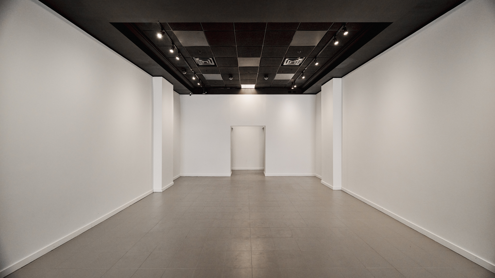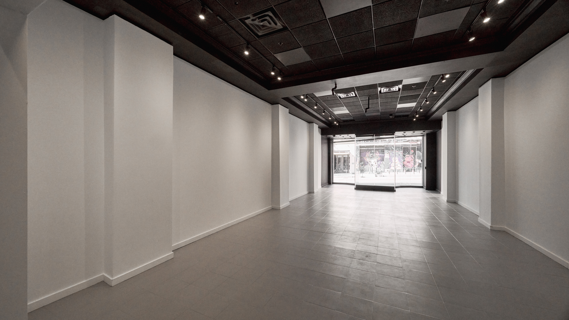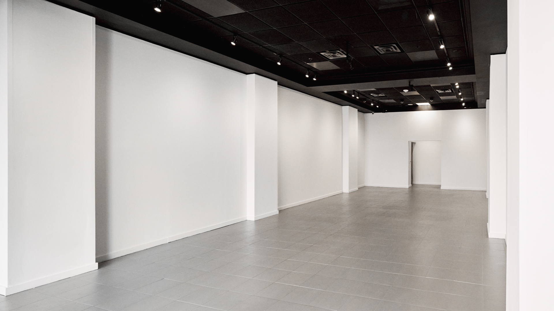The gallery features clean white walls, large-format tile and concrete flooring, professional track lighting, and integrated AV capabilities for digital artwork displays. An equipped kitchenette, private bathroom, and alower-level storage area provide essential operational support. The flexible layout accommodates rotating exhibitions, brand activations, private viewings, and product launches with ease.