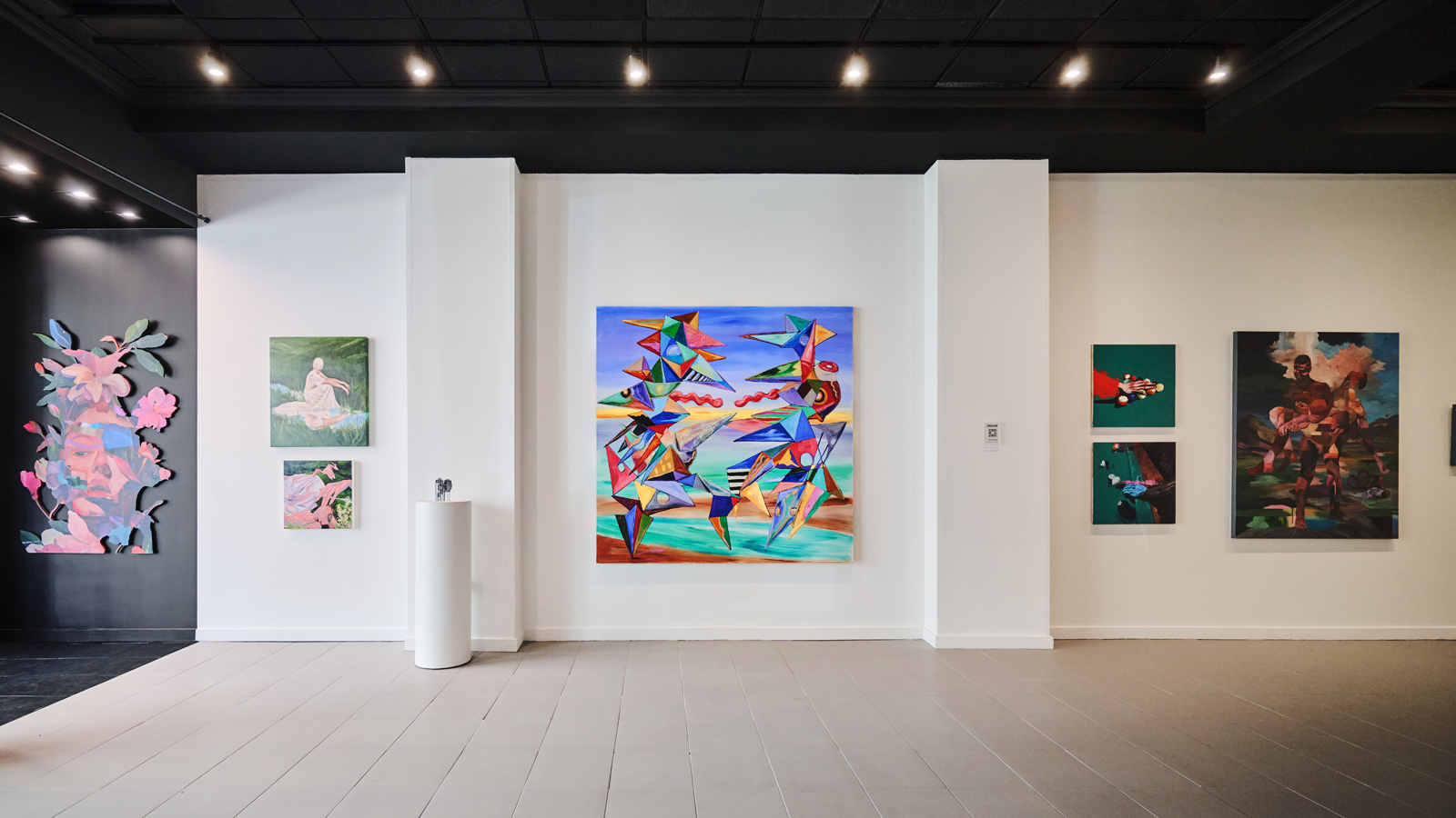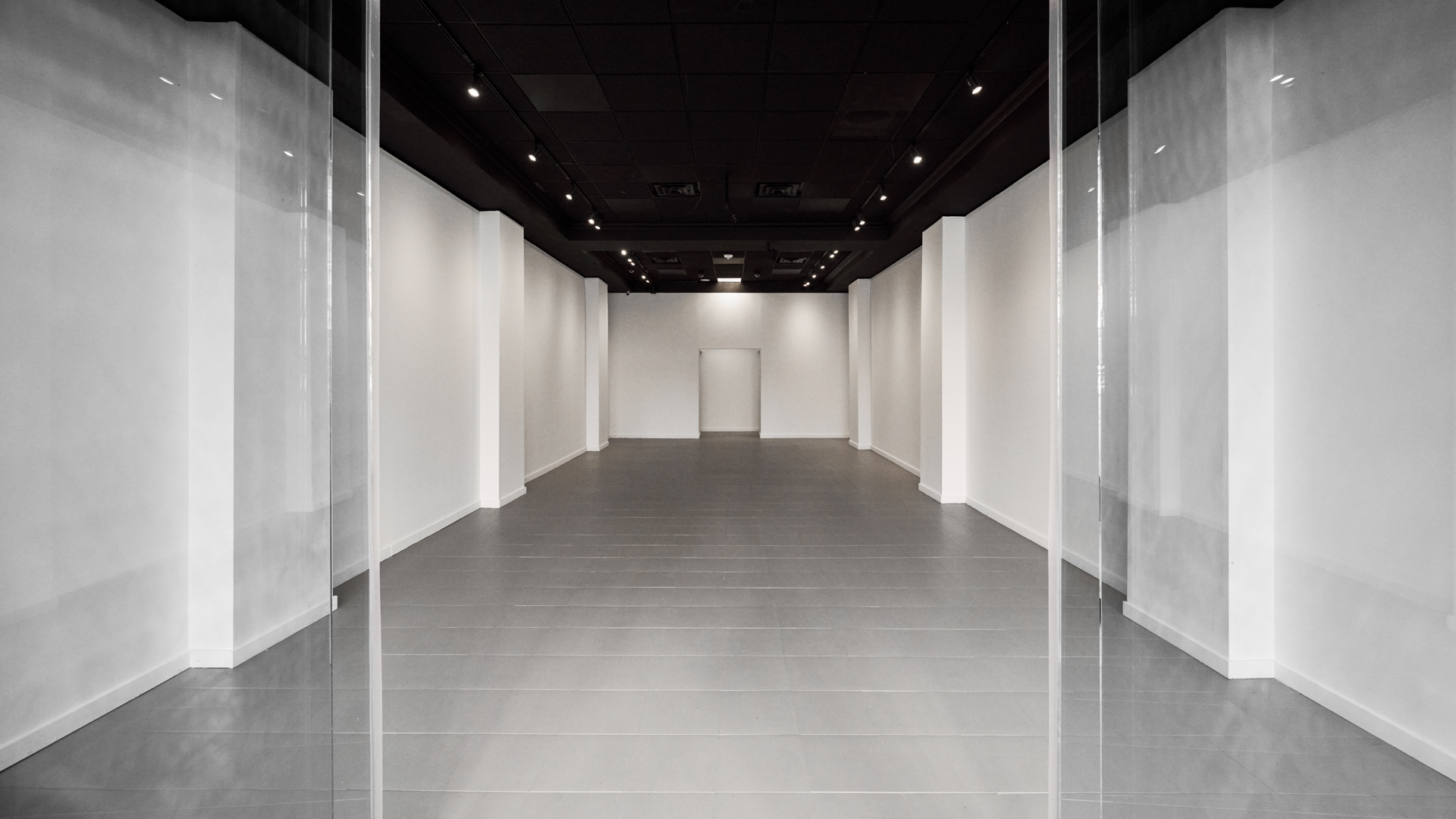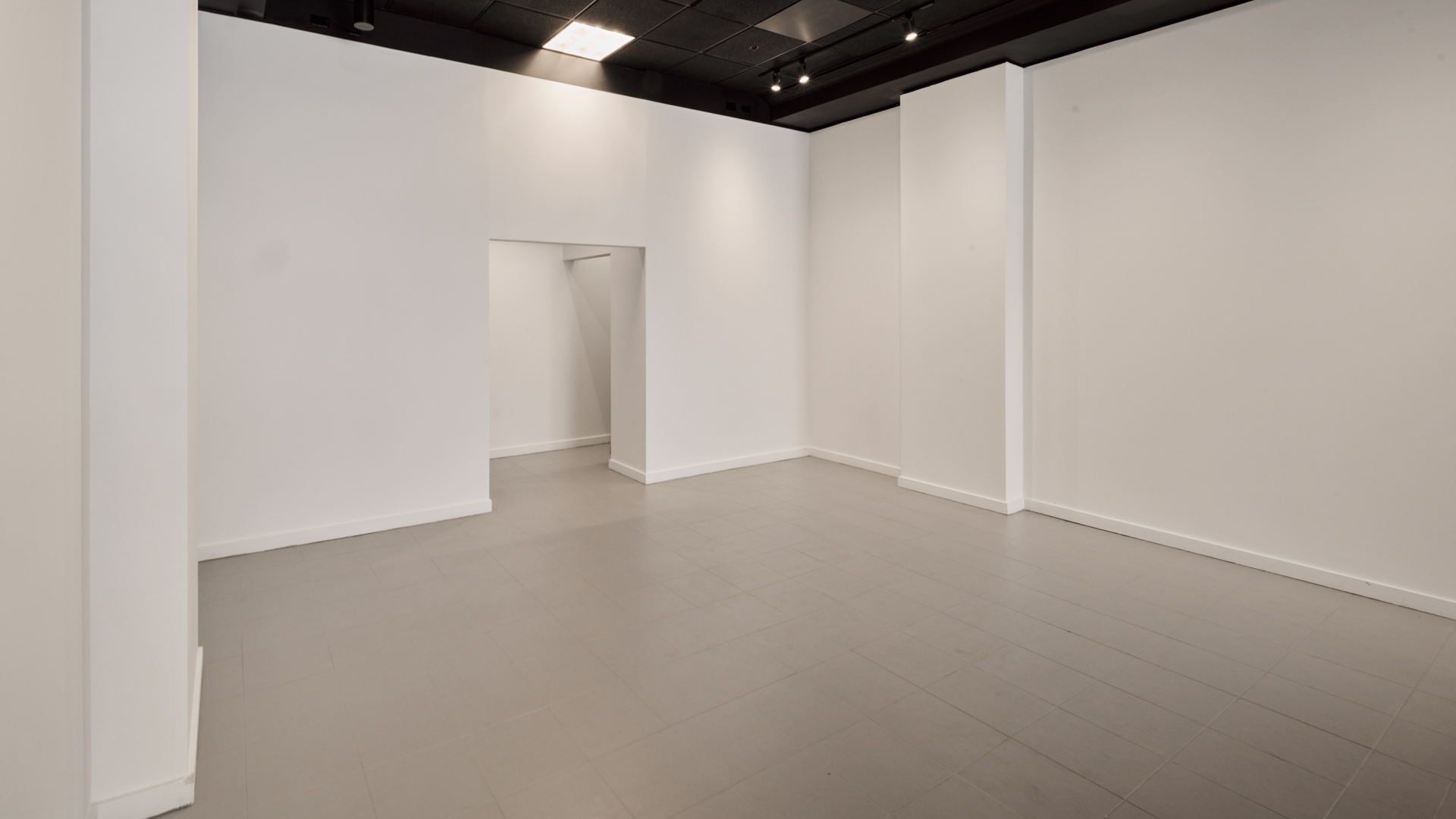 The gallery features clean white walls, large-format tile and concrete flooring, professional track lighting, and integrated AV capabilities for digital artwork displays. An equipped kitchenette, private bathroom, and alower-level storage area provide essential operational support. The flexible layout accommodates rotating exhibitions, brand activations, private viewings, and product launches with ease.
