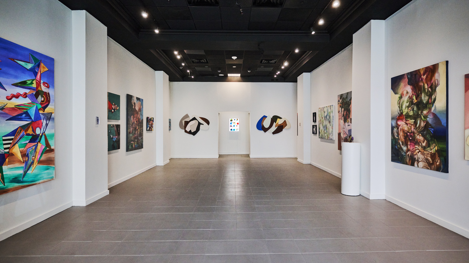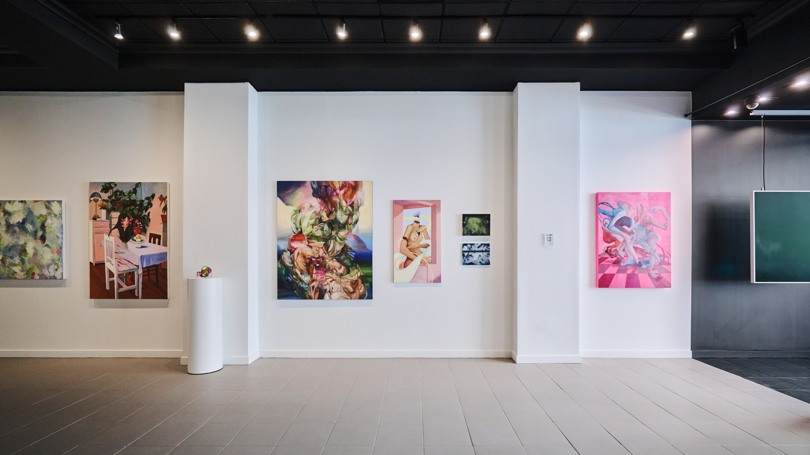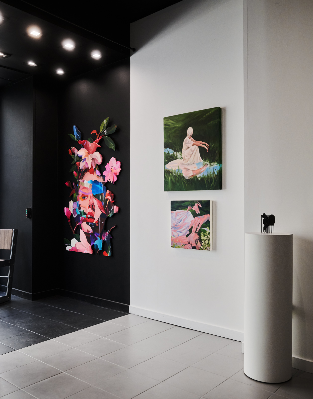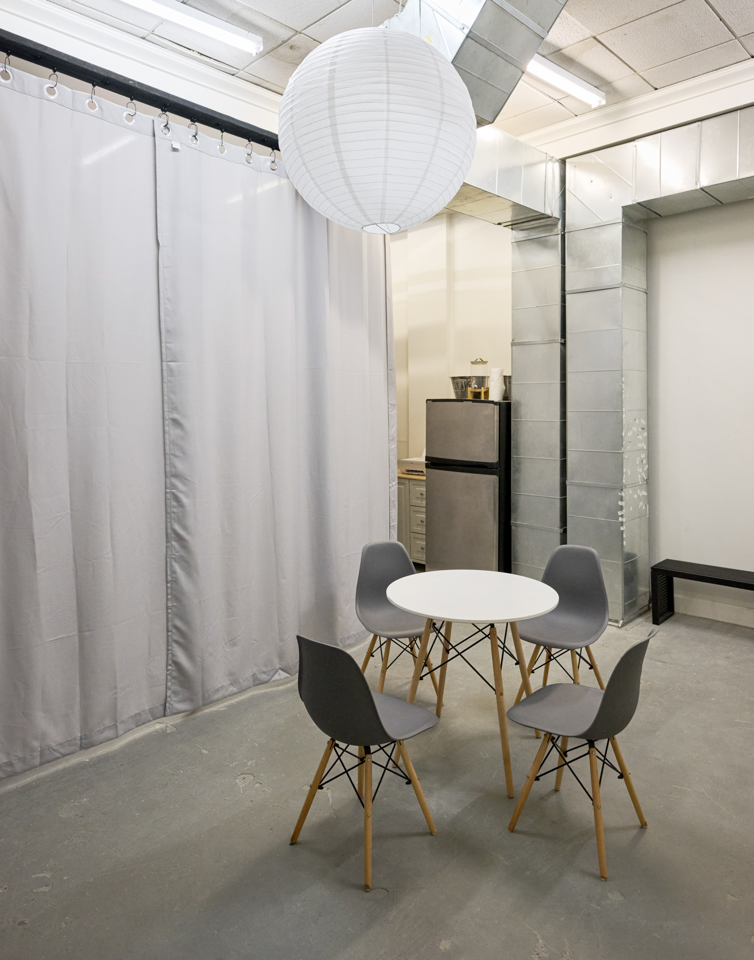 The gallery features clean white walls, large-format tile and concrete flooring, professional track lighting, and integrated AV capabilities for digital artwork displays. An equipped kitchenette, private bathroom, and alower-level storage area provide essential operational support. The flexible layout accommodates rotating exhibitions, brand activations, private viewings, and product launches with ease.