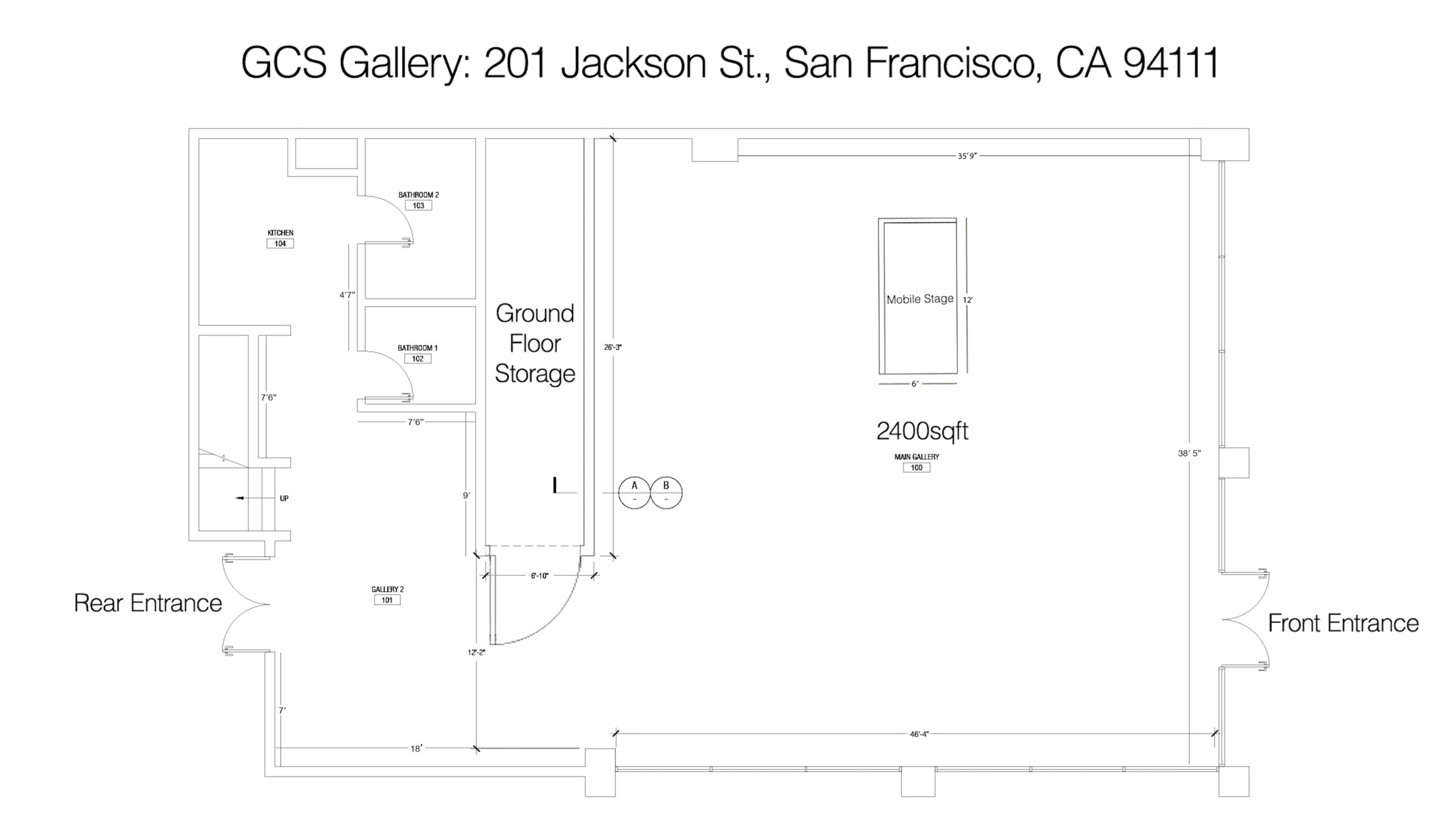 The gallery features a versatile floor plan; complete with a movable stage and two hero walls designed for impressive showcasing, enabling multiple configurations. Important details include dual double-door entrances ensuring accessibility and convenience. Two spacious bathrooms and an equipped kitchenette are perfect for supporting large crowds.